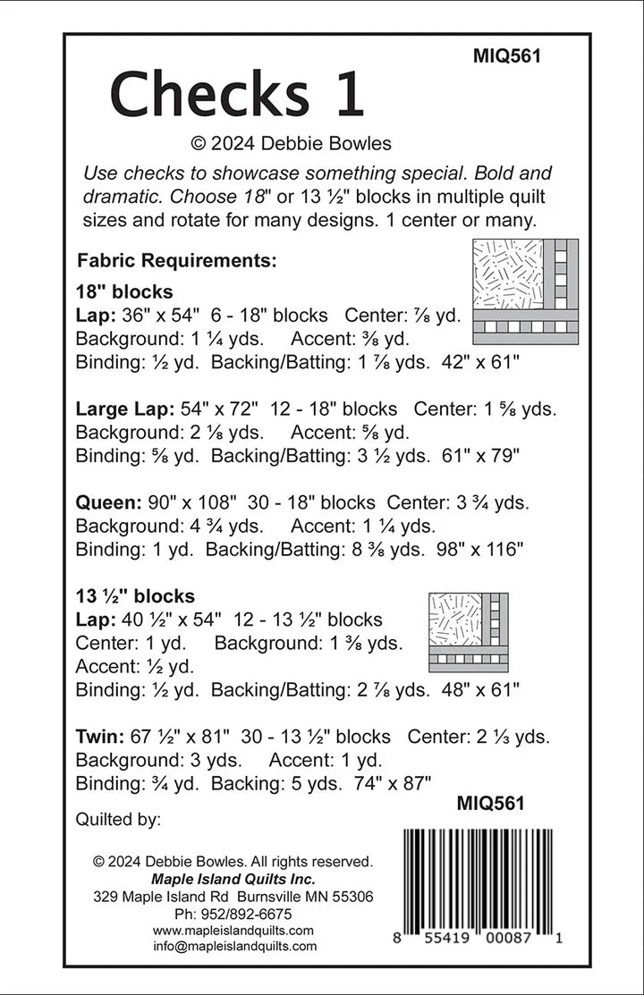Use bold checks to showcase something special and make a dramatic quilt. Two block sizes and 5 quilt sizes. Rotate blocks for other layouts. One center fabric or many.