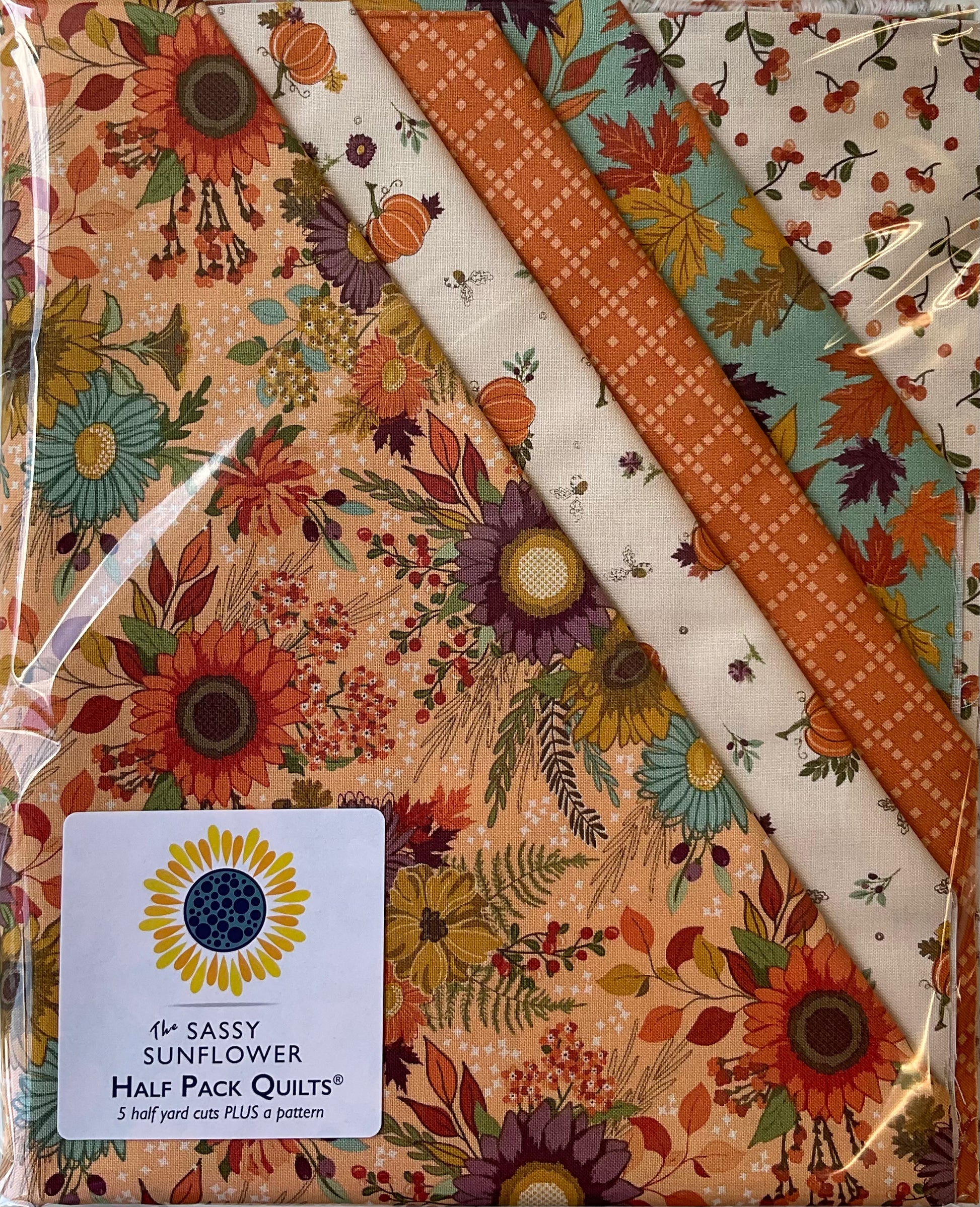 Each Half Pack contains Five Half yard cuts of fabric and is enough to make an entire quilt top, or Tippy Tote! Your choice of one original Sassy Sunflower pattern is included with each Half Pack purchase. Note which pattern you would like in the notes section of your shopping cart.