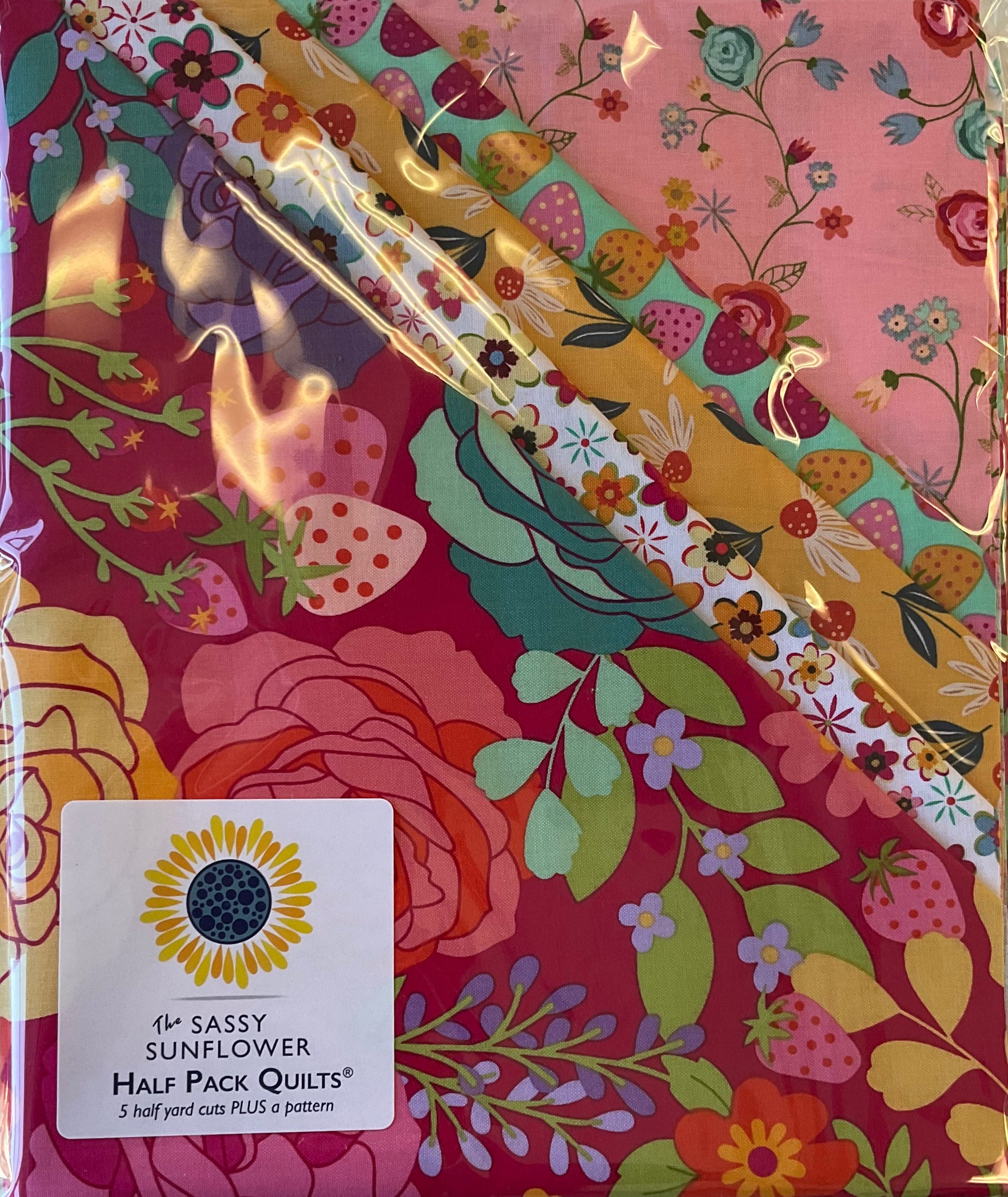 Each Half Pack contains Five Half yard cuts of fabric and is enough to make an entire quilt top, or Tippy Tote! Your choice of one original Sassy Sunflower pattern is included with each Half Pack purchase. Note which pattern you would like in the notes section of your shopping cart.
