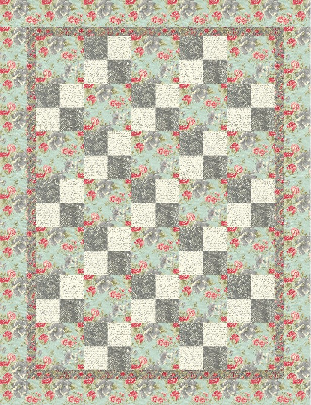 This quick and easy pattern features a four patch checkboard design composed of alternating floral and solid fabric squares, with a floral border surrounding the central design. This is suitable for the confident beginner who has basic quilting skills.