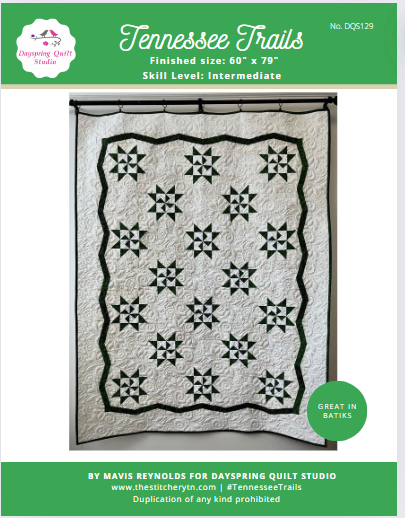 This quilt features a classic design with a repeating pattern of star blocks. The stars are primarily composed of two shades of green on a white or cream background. The stars are set against a background of triple rail blocks that create a woven appearance, adding texture and depth to the design. The quilt is bordered with a narrow green band that has a slightly wavy, irregular edge, adding a dynamic and flowing element to the overall design. Surrounding the green border is a wide, light-colored outer border that frames the entire quilt. The color palette is simple yet striking, using green and white tones to create a fresh, crisp look. The overall layout is symmetrical, with the star blocks evenly spaced across the quilt. Two days. 8 hours of instruction. Pattern and fabric not included. Confident Beginner to Intermediate.