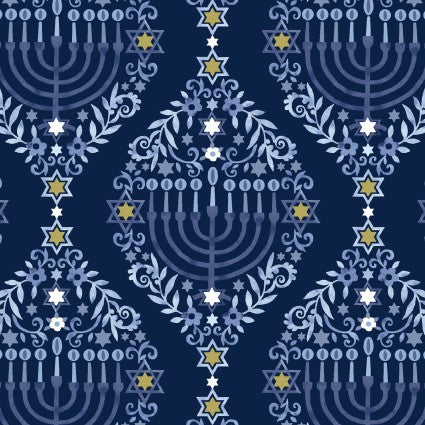 The Gift of Light - Menorah Damask, Dark Blue - PER 1/4 YARD