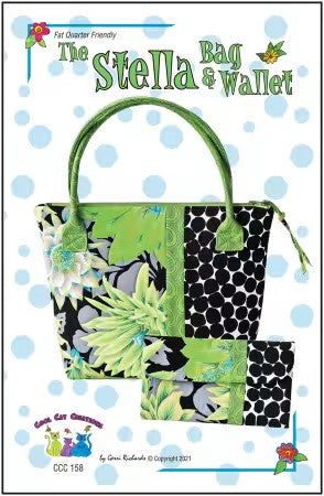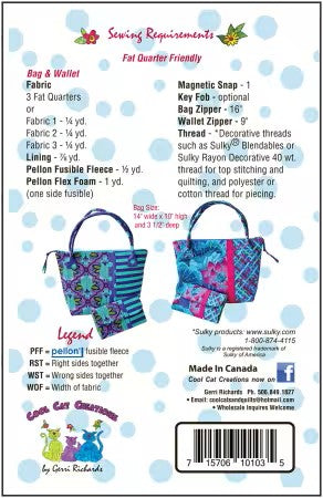 Make this adorable bag and matching wallet with just 3 of your favourite fat quarters along with the lining. The bag has a zippered top and divided pockets on both sides of the lining plus a key fob. The wallet has a long pocket for cash, small pockets for cards and a zippered pocket for coins. Both bag and wallet use a one-side fusible foam interfacing as a foundation. The pattern is clearly written with lots of color illustrations.